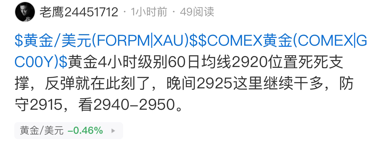 $黄金/美元(FORPM|XAU)$ $COMEX黄金(COMEX|GC00Y)$ 黄金在 2926 精准做多,看 2940 直接到位,下方 2920 很明显的支撑,在低位做空我相信没多少人会去追的。一直关注老鹰的朋友都知道,老鹰的dan子通常都是舍小利取大利,这一波轻轻松松就是十几美jin落袋。