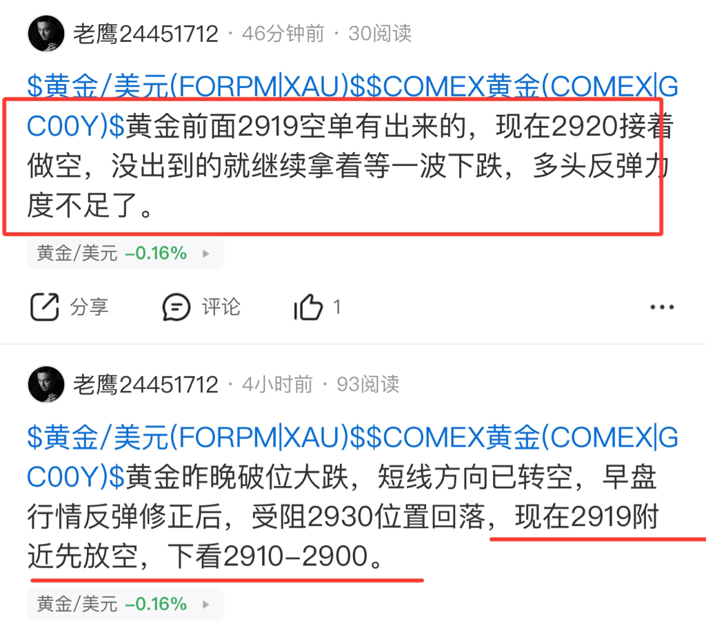 $黄金/美元(FORPM|XAU)$ $COMEX黄金(COMEX|GC00Y)$ 黄金2919做空,现在下跌2909(10点),行情一直都有进去的机会,朋友们都做到了吧?