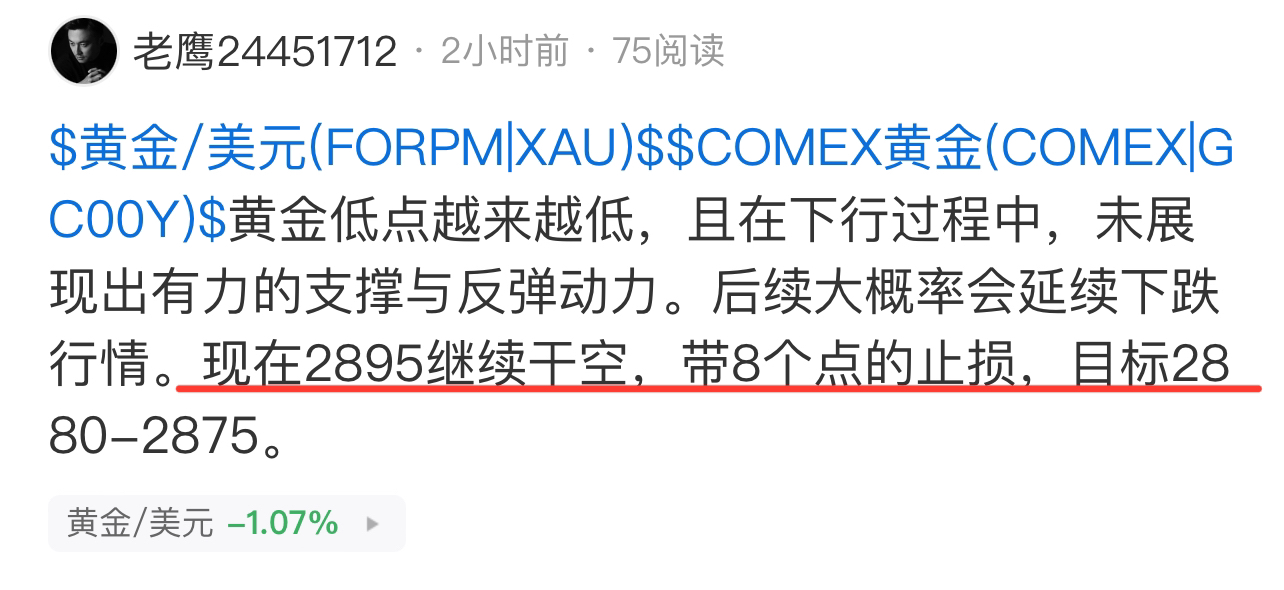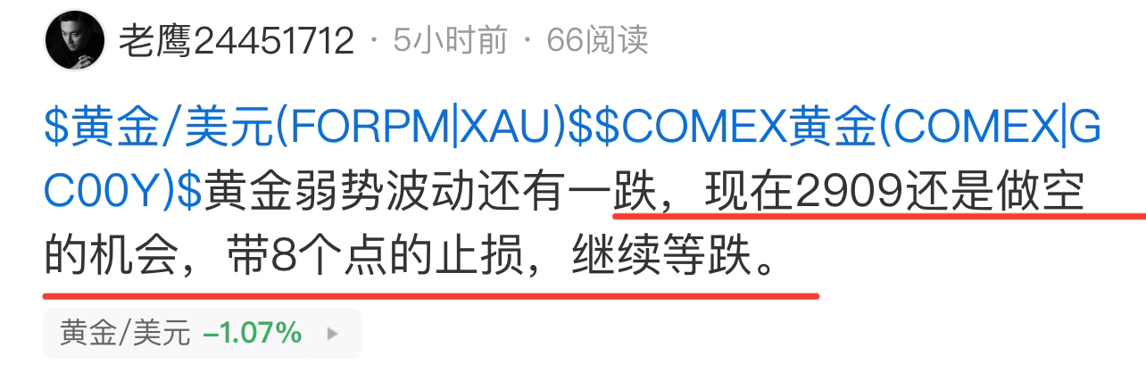 今天黄金市场大动作,白天直接暴跌40多美金。从2914开始布ju空单,一路到2888,连续三波空,总共拿下30多点。全是现价单,没半点含糊。只有没本事的,才给模糊点位。老鹰多空明确,凭实li说话,不搞花架子。