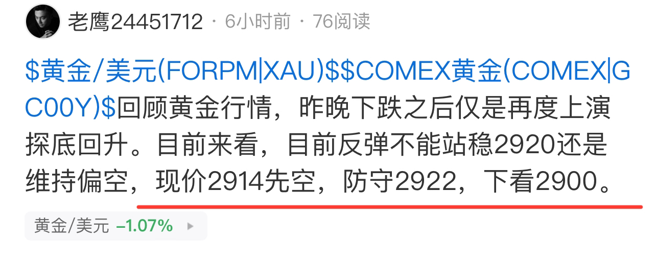 精准狙击,实li见证。今天黄金市场大动作,白天直接暴跌40多美金。从2914开始