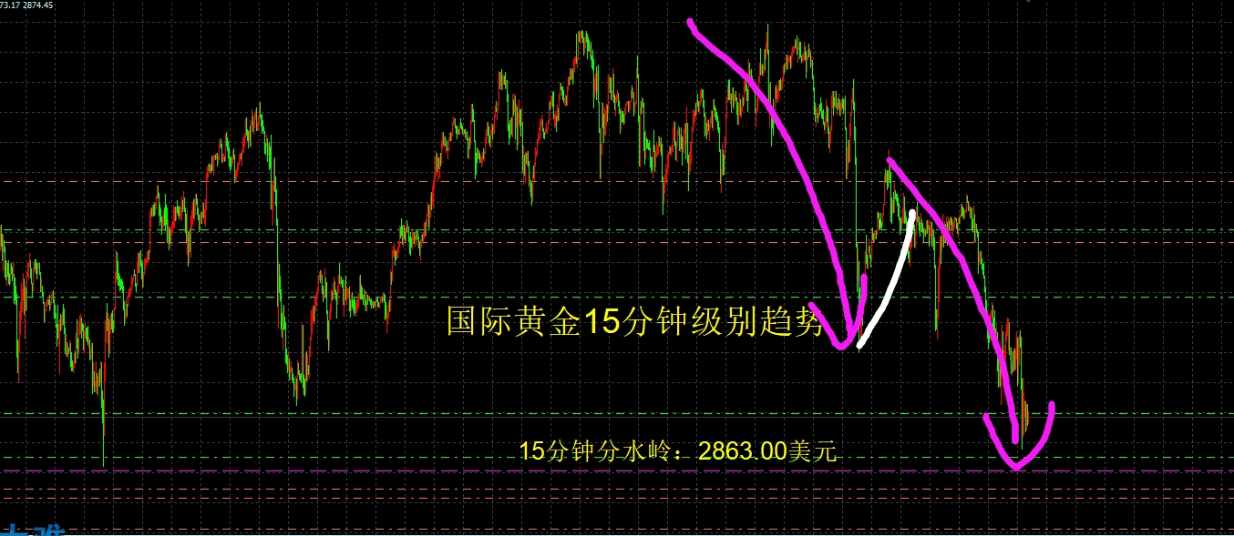 国际黄金今天晚上连续下探,最低逼近了15分钟级别上涨趋势中的最后防线2863美元