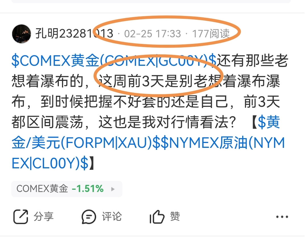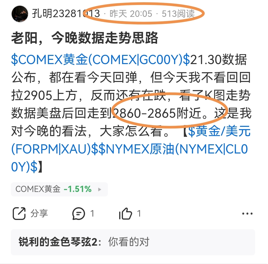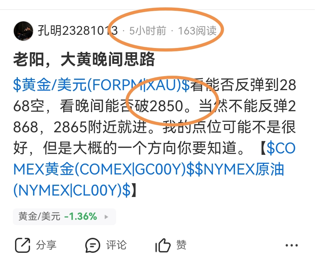 $黄金/美元(FORPM|XAU)$ 大家好好回忆一下这周行情,一周就五天,前3天我说看震荡,低4天我看跌到2865附近,昨天晚间最低2867。今天我看跌2850,目前最低2836。一周的行情,那天漏了那天没对上。实力还需要我重复在重复吗。【$COMEX黄金(COMEX|GC00Y)$ $NYMEX原油(NYMEX|CL00Y)$ 】