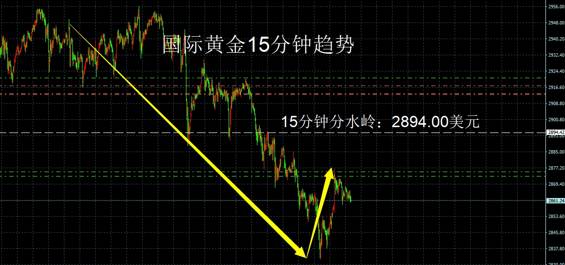跑了一天了,国际黄金冲高到15分钟级别的压力附近后,并没有着急下跌,短期出现了抗