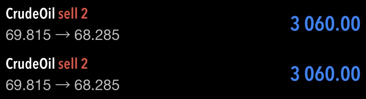 完美,原油已经低到目标位,现价68.30位,咱们手上拿的69.80-90空单,全部平仓出局,拿下15美金利润,操作2手,仓位增值3060美刀。