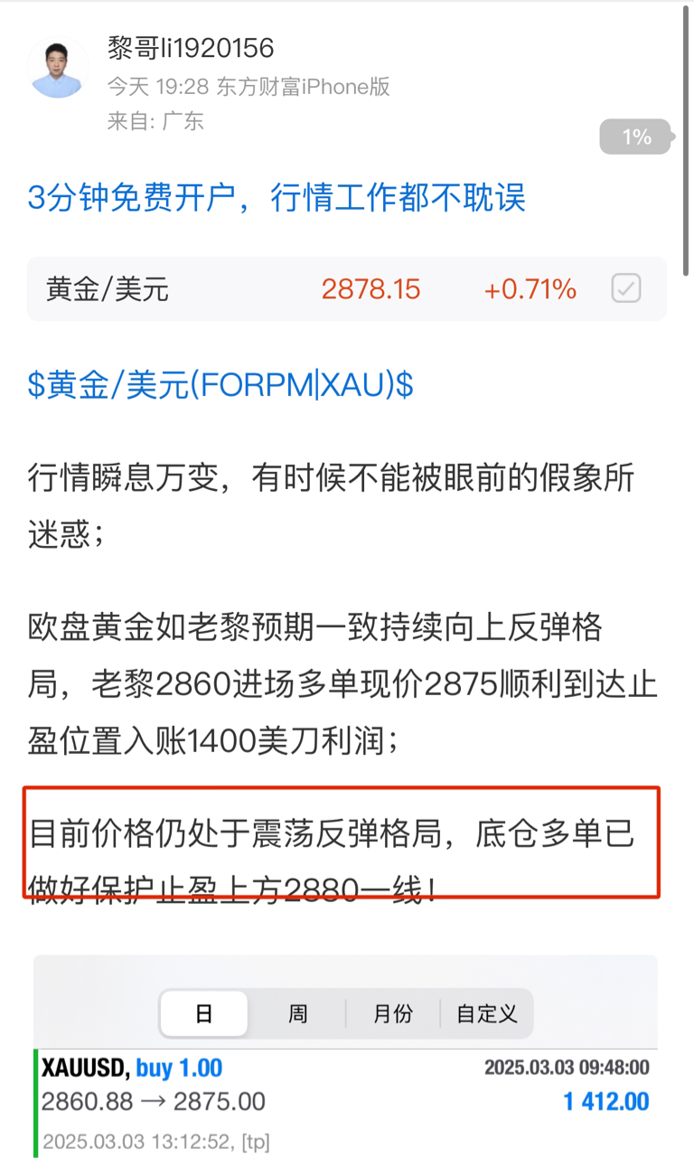 而老黎日内多空布局2660多止盈2675/80,2883/85空止损2893,一盈一损综合拿下2200美刀利润入账;