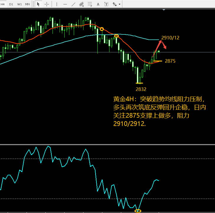 4小时图来看,金价昨日晚间二次突破2877已经明显转强,筑底反弹拉升上涨企稳顺势做多方向操作,关注昨日二次破高大涨的低点2873-2880区域位置;
