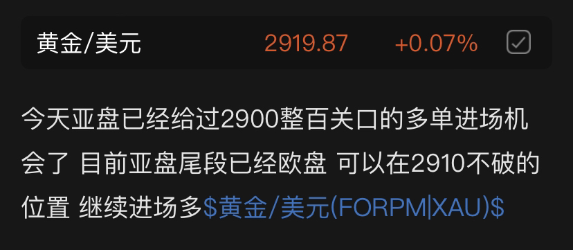黄金2910多,现价2919,浮赢9点。 稳健先收线离场,激进拉好保护继续上看2930附近$黄金/美元(FORPM|XAU)$