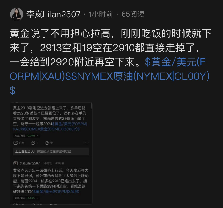 黄金今天反复的震荡,ADP数据公布出来利多,目前没什么波动预计是在酝酿行情,2918的空下来2911先走,一会看看再做。
