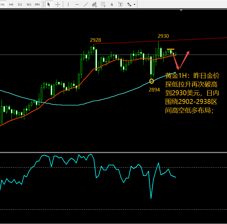 昨日国际金价日线收取十字星,最高上涨到2930附近出现再凌晨高点,晚间ADP数据大幅利多金价反而出现大跌最低到2894美元,刚好衔接MA5日均线支撑带快速反弹上涨,且突破了前一日的高点2928,从本周本轮上涨幅度来看,金价也是到了拐点 压力区域,随时反复冲高后回落调整,连续3个交易日上涨并没有出现明显的调整,反而再次新高,总体来看金价依然处于筑底反弹上涨阶段,昨日白天再2911做多顺利大涨到2922,晚间数据公布后2914做空再次大跌到2894,多空均拿下利润,从日线级别走势来看,金价今日依然还是方向回落做多为主,冲高突破2930上方出现高点再布局做空看调整,下方支撑关注2908、2902位置;