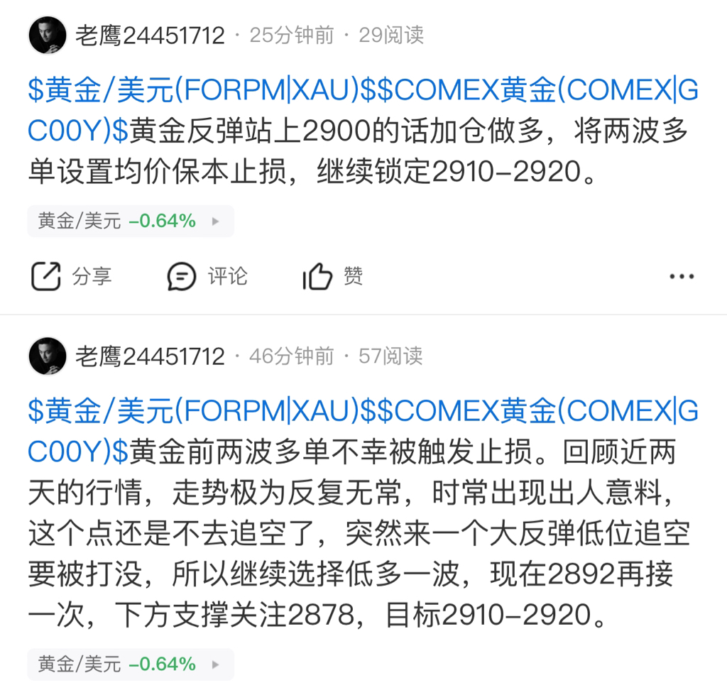 $黄金/美元(FORPM|XAU)$ 黄金2892做多方反弹上来2900继续做多,现在反弹2905,这一波16个点直接换回前面失去的青春。有时候,偶尔错单很正常,最要命的是死扛和被套,我们之所以一定要控制好风险,就是为了下一次出手的机会。
