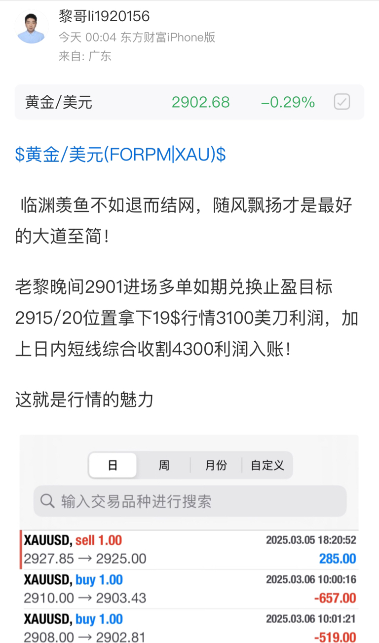 周四黄金整体呈现宽幅震荡格局,而老黎日内布局3单2盈1损综合拿下4300美刀利润入账;