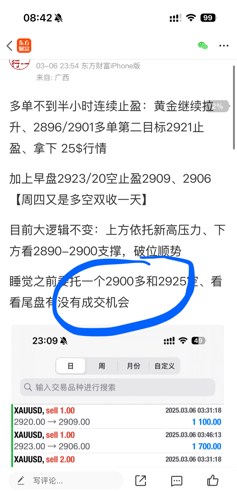 早盘探底回升、老戴周四尾盘委托2900多,现价2908拿下8$、浮盈继续持有