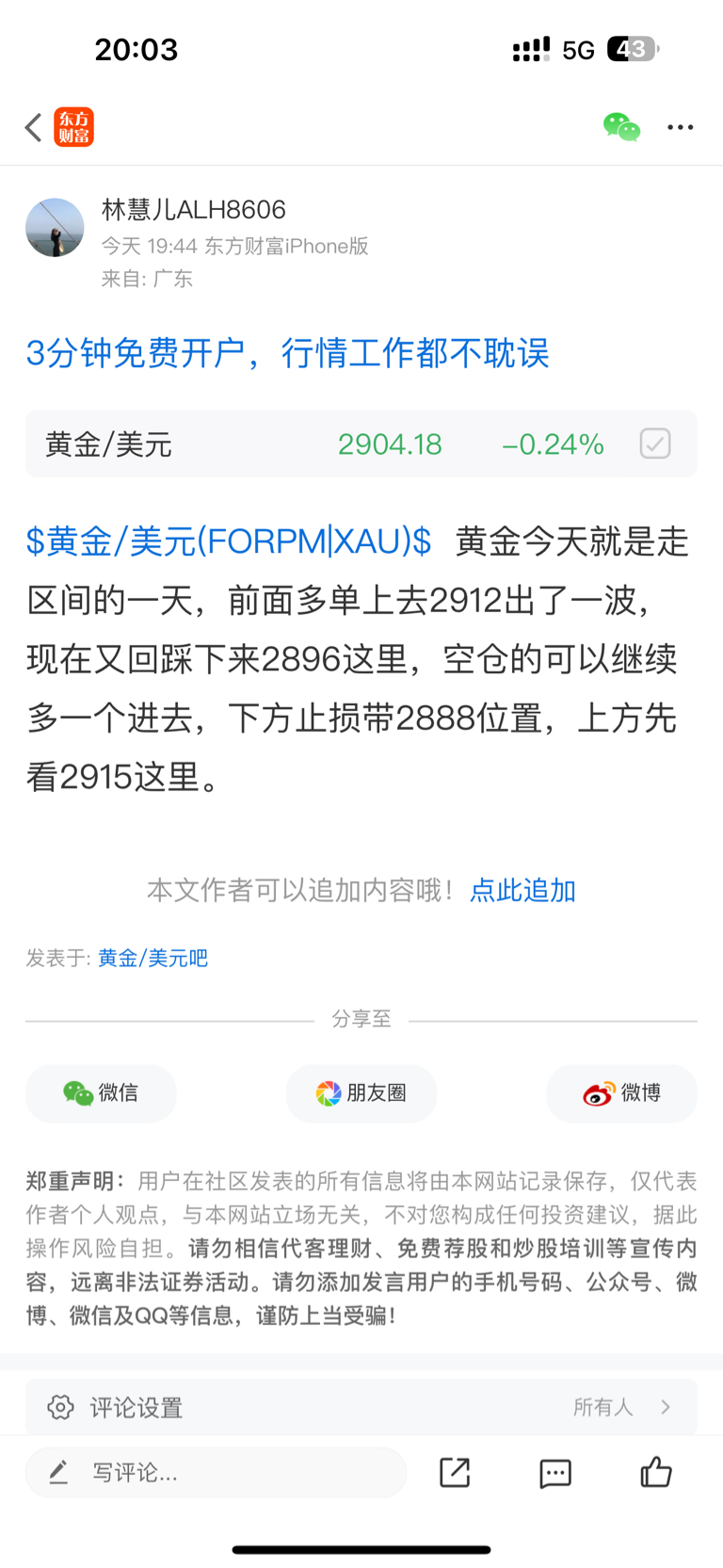 $黄金/美元(FORPM|XAU)$ 黄金目前反弹力度逐步减弱,但只要点位进的好,还是能吃上肉的,正如我前面所说,今天就是刷单行情,多空都有机会,安排在2896的多,现在又是7/8美金的li润,跟进做个减仓,一会看黄金反弹力度如何,若还是无法反弹企稳2915上方,那么晚间可以考虑做空了。
