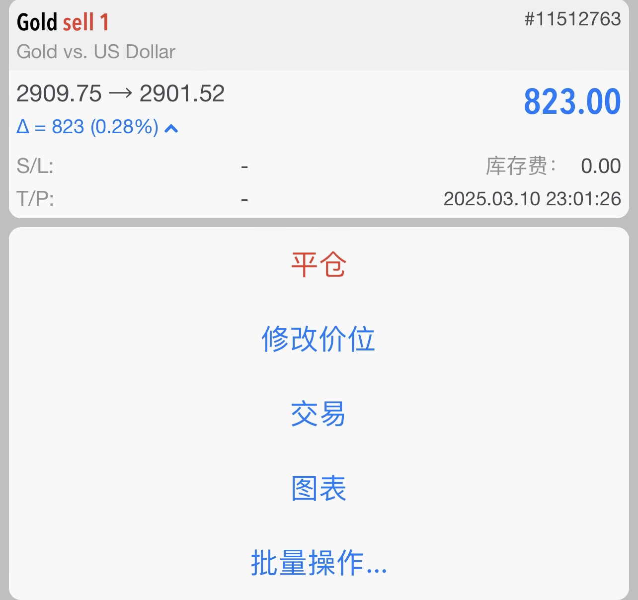 黄金昨晚凌晨跌到2880,不知道有没有朋友跟上车,昨天晚上9点多凌云就提示到2910的时候可以做空了。可惜没能在最好的点位出了 ,以免夜长梦多。在8美金左右就出了。