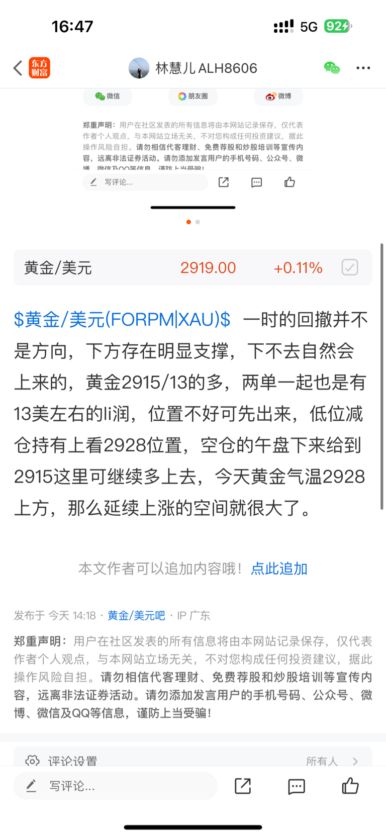 $黄金/美元(FORPM|XAU)$ 今天的黄金跟周一的剧本有点相似呀,又是走区间的行情,目前盘面多空都没有延续,前面低位做多已经出了一波,后续给到在2915这里可继续多上来,正在浮盈中,既然这行情来回波动,那么就稳健为主,做个减仓,上方还是关注2928这里,空仓的下去给到2913这里继续多上去。