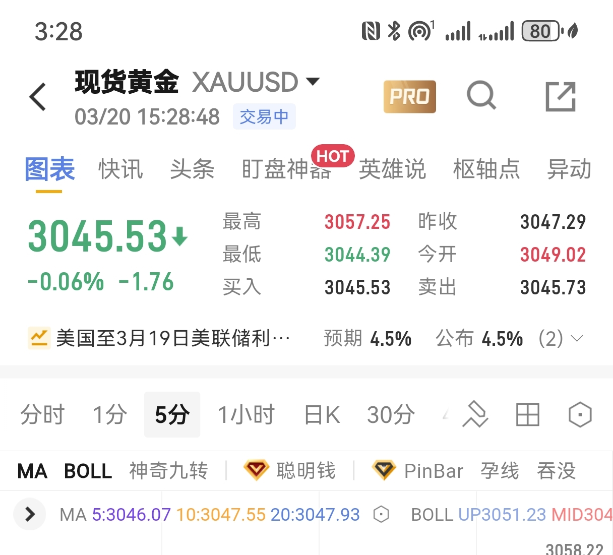 $黄金/美元(FORPM|XAU)$ 大黄当前在3045支撑位附近来回波动,先别着急入场。昨天的深V走势大家还记得吧,老阳昨天都栽了跟头。稳住别冲动,等我后续提示再行动。【$COMEX黄金(COMEX|GC00Y)$ $NYMEX原油(NYMEX|CL00Y)$ 】
