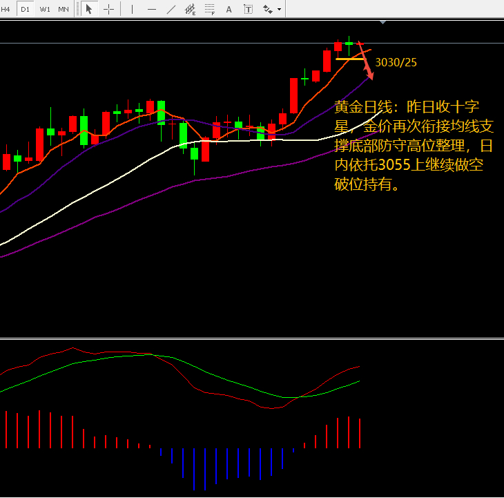 国际金价昨日日线收十字星,本周三连阳大涨后转调整,金价至2855大涨到3058,涨幅203美元,3月份大涨时间和幅度已经接近尾声,再冲击历史高点3060也随时昙花一现出现砸盘大跌的风险,上涨空间20美元幅度不及快速砸盘50-80美元空间,无论从大涨周期价格运行还是空间上都不应再过于看涨追多,如若继续乘胜追击顺势做多要等到3月份收线,也就是衔接到4月份企稳再抄底做多上涨,趋势多头结构完好,每一轮大涨后均会出现技术性修正调整后再迎新一轮的上涨,操作上一定要把握趋势拐点时间和价格周期演变;