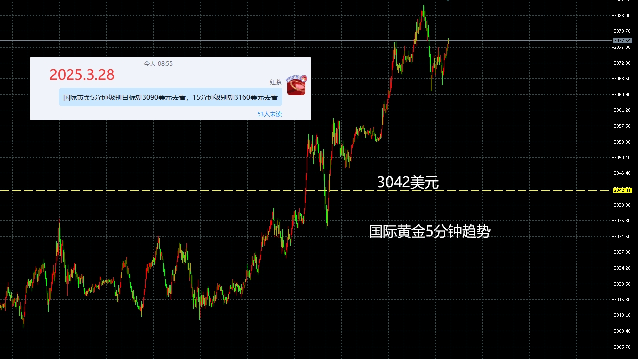 前面,红茶讲到了5分钟级别的目标看3090,今天国际黄金最高上涨到了3086美元