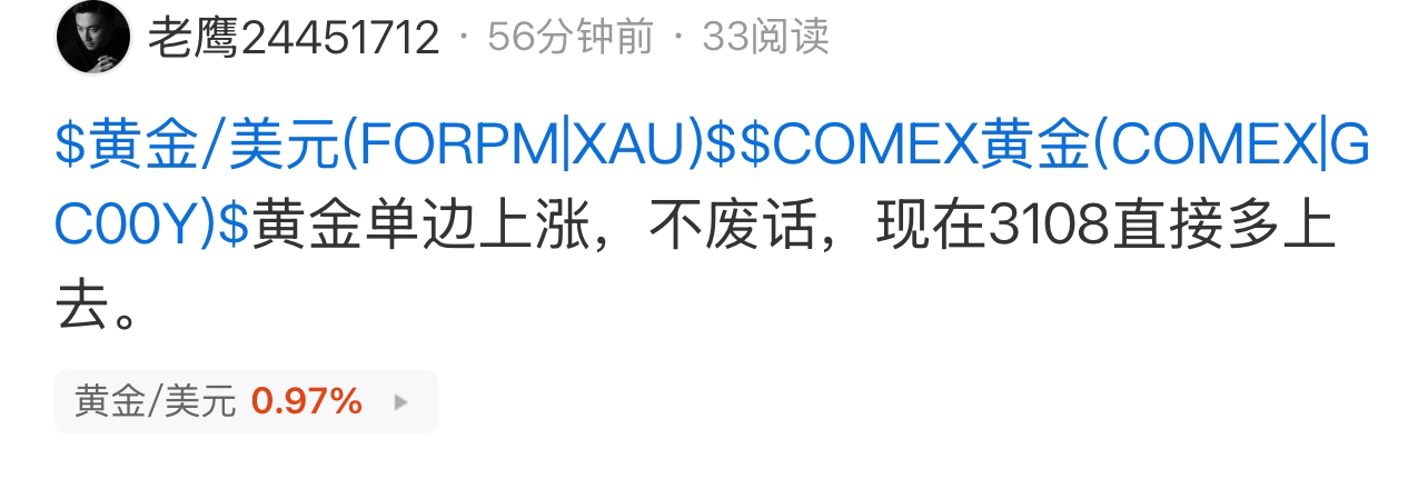 $黄金/美元(FORPM|XAU)$ 黄金3108又直接多上来3119拿下11点,这么好的趋势,都说了闭眼做多的行情,大dan干就是了。
