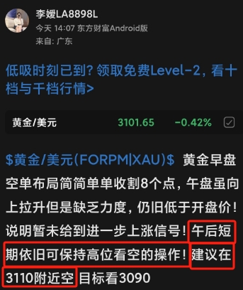 黄金午盘3108位空单布局,现盘面给到3101位!再次收下7个点LI润!现震荡行