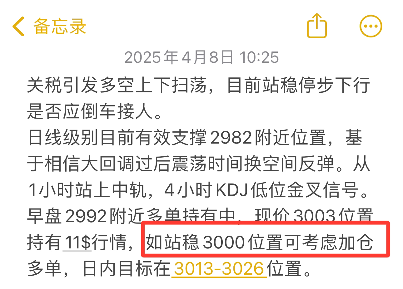 关税引发多空上下扫荡,目前站稳停步下行是否应倒车接人。早盘2992附近多单目