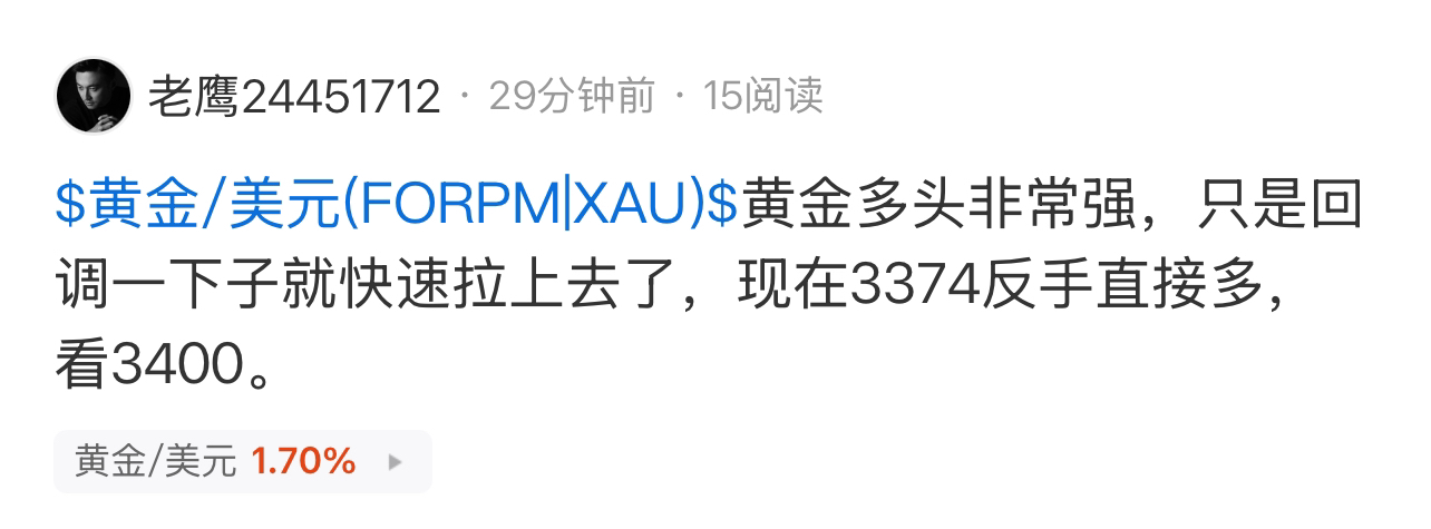 $黄金/美元(FORPM|XAU)$ $COMEX黄金(COMEX|GC00Y)$ 黄金猛涨!3374果断做多,现在上来3384可先出一波。黄金稍作回调便快速拉升再创新高,多头势如破竹,犹豫不得,目标直指3400。
