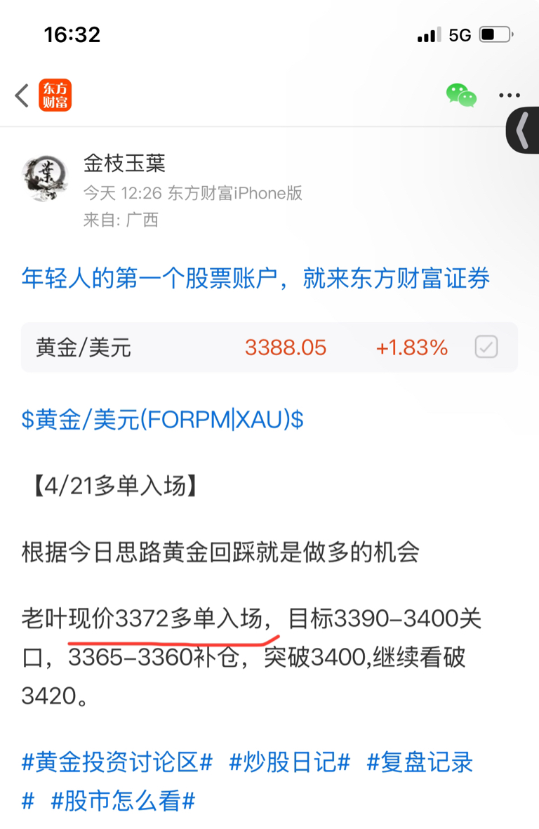 【4/21多单再次入场】老叶说过回落就是多的机会3372底仓继续持有,回调338