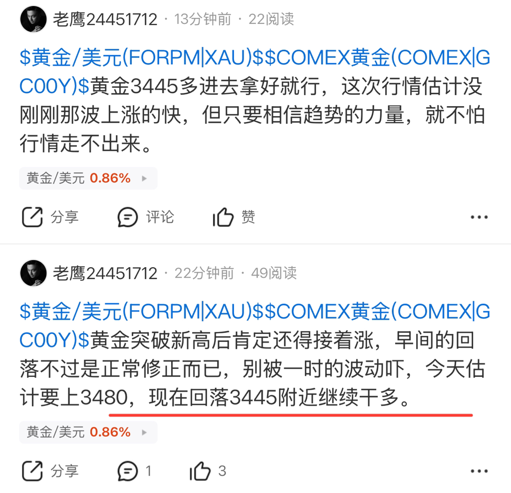 $黄金/美元(FORPM|XAU)$ $COMEX黄金(COMEX|GC00Y)$ 黄金3445第二波多,现在已经到了3457这里,求稳的12美jin先落袋,可预留小仓位继续往上冲。
