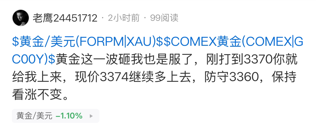 $黄金/美元(FORPM|XAU)$ $COMEX黄金(COMEX|GC00Y)$ 黄金3374多没出完的现在3395出来了。黄金前面也说了回调震荡不是转空,没跌下去别慌的不行,现在企稳3350上方多头仍是主旋律,下面回落3380附近可继续多,目标还是看3420-3430。