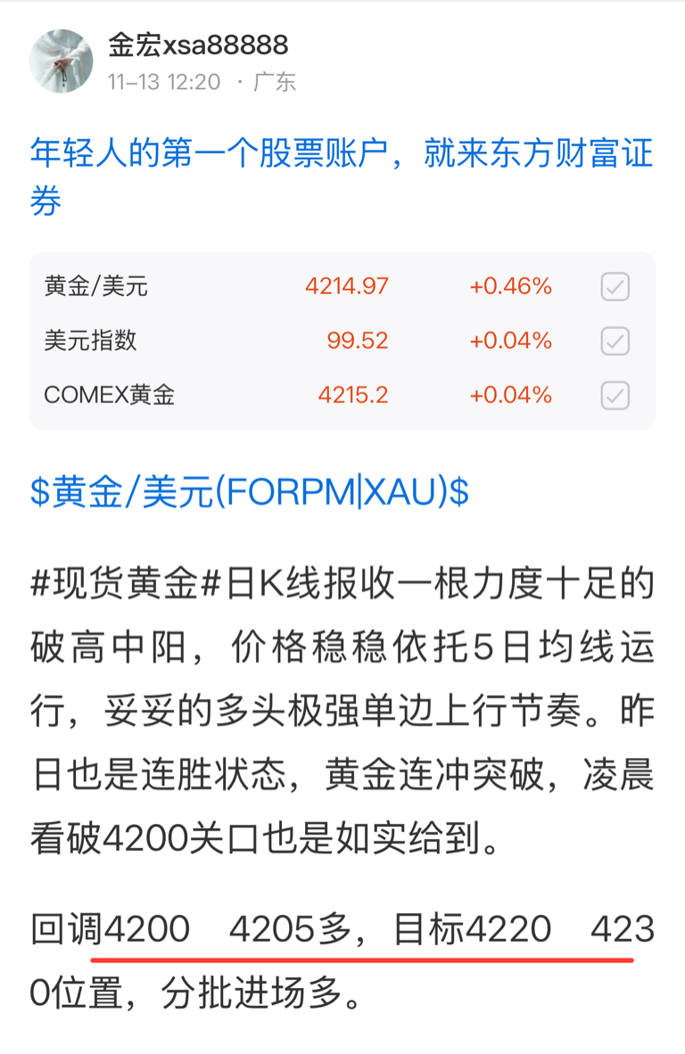 $黄金/美元(FORPM|XAU)$ #现货黄金#黄金冲高回落,精准布局切入点4200 4205附近,最低回调4203位置,现在4216位置稳健离场,先收120点位,一发入魂$美元指数(QQZS|UDI)$
