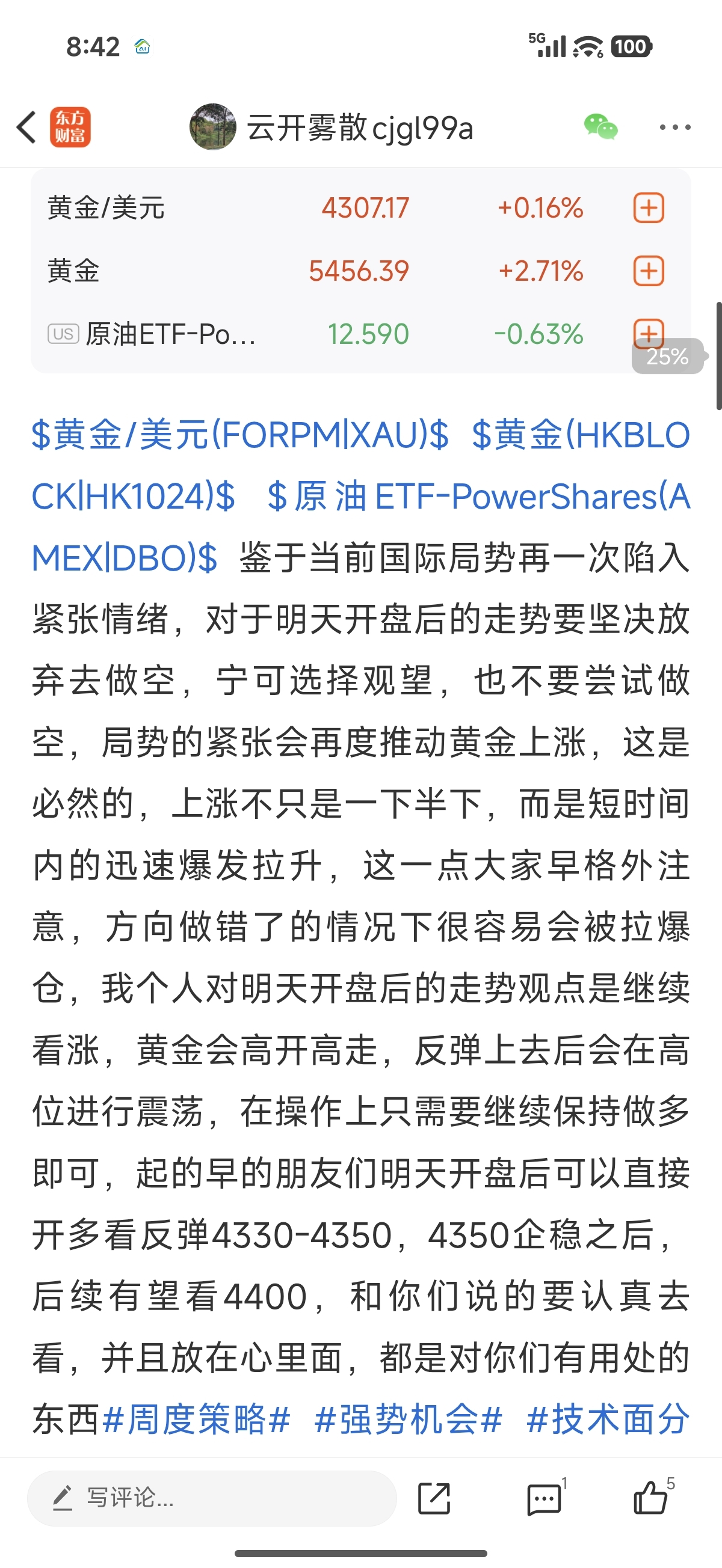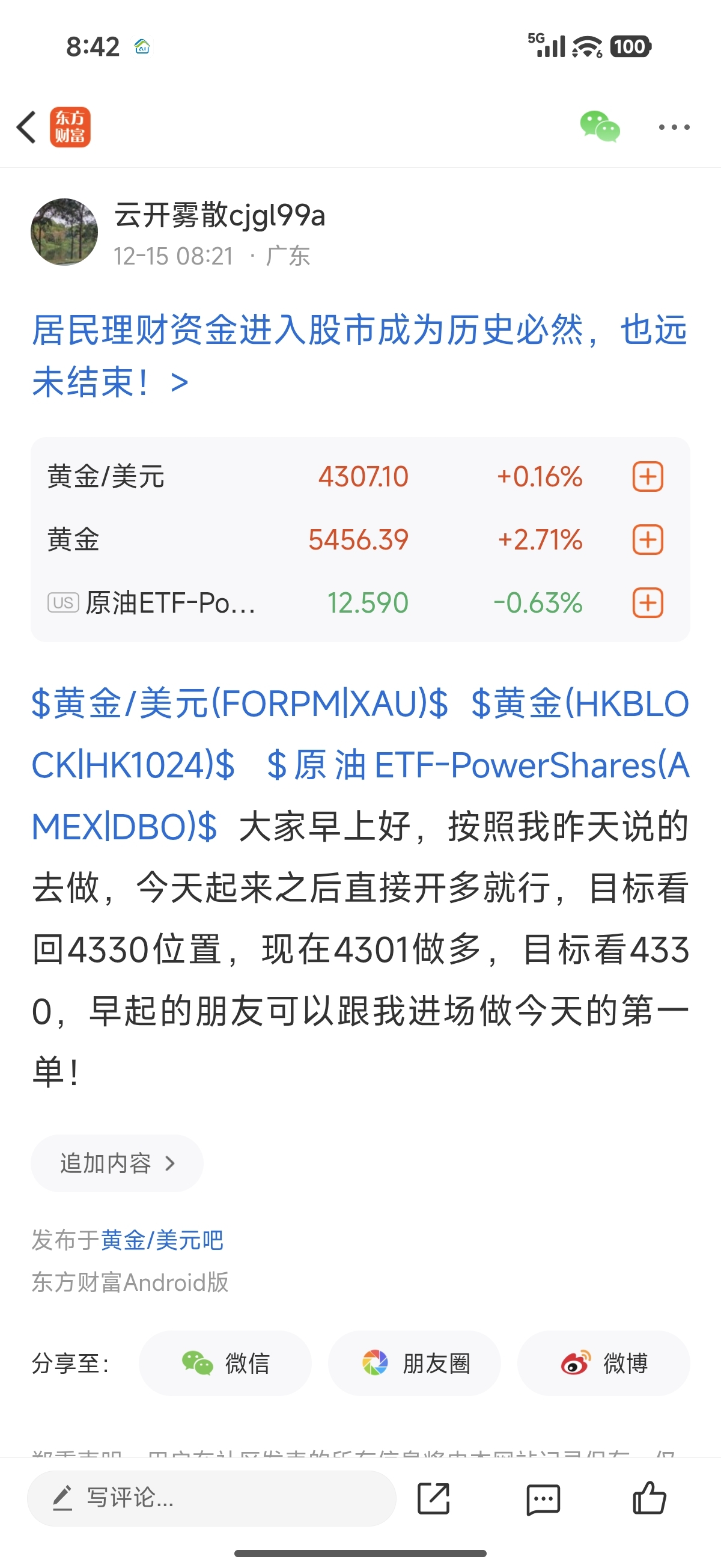 $黄金/美元(FORPM|XAU)$ 昨天已经对今天开盘后的走势做出过详细的分析跟布局了,我说过了,趋势还是继续看涨,思路还是继续做多,今天只要一开盘就可以直接做多,目标看4330,刚才也在4301提示你们做多,还没跟上的自己找机会进场,目标看4330位置即可!$原油ETF-PowerShares(AMEX|DBO)$ $黄金(HKBLOCK|HK1024)$