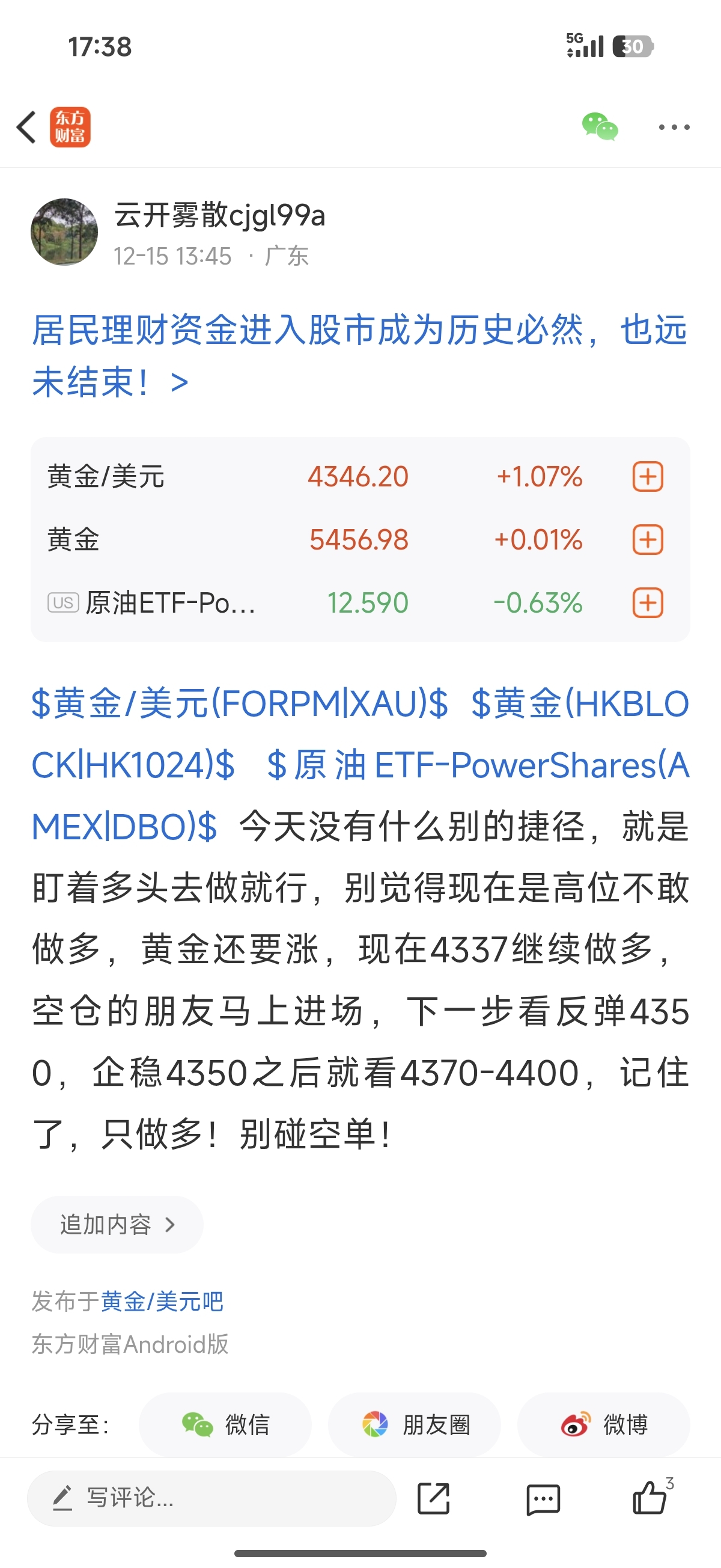 $黄金/美元(FORPM|XAU)$ $黄金(HKBLOCK|HK1024)$ $原油ETF-PowerShares(AMEX|DBO)$ 再次拿下130个点的收获,昨天就跟你们说了今天看反弹4350,今天也跟你们说了目标看4350位置,现在也确确实实在4350目标带你平仓,分毫不差,精准无误,我一直都是靠实力说话,用最终的结果让你们折服!