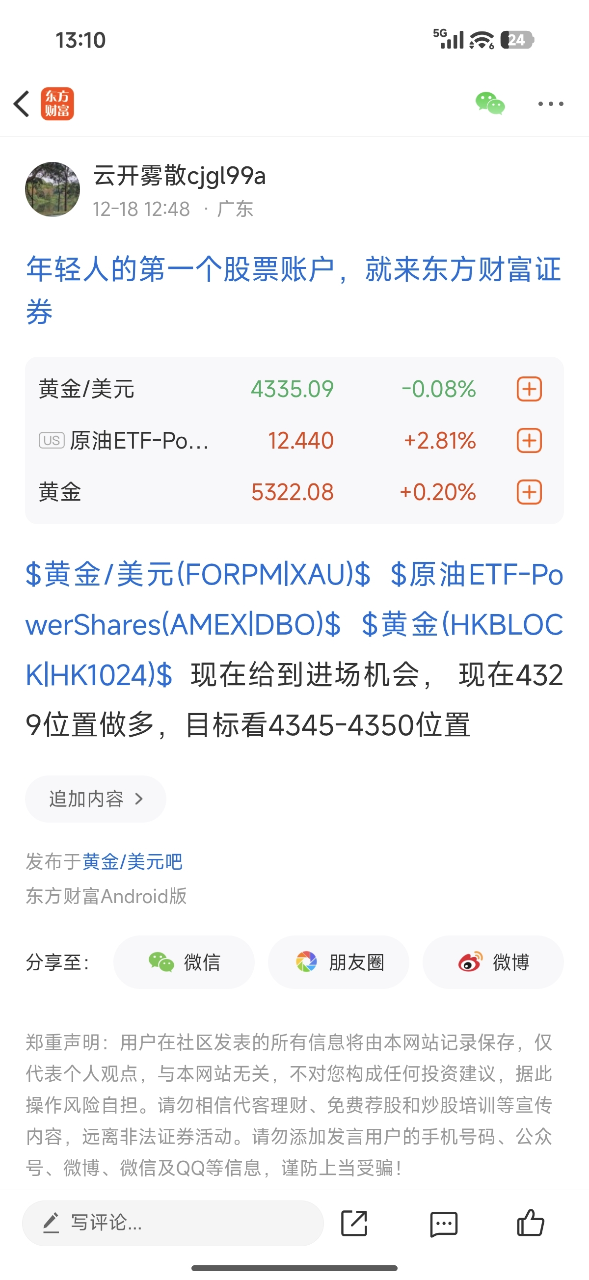 $黄金/美元(FORPM|XAU)$ $黄金(HKBLOCK|HK1024)$ $原油ETF-PowerShares(AMEX|DBO)$ 前面说过了,只要回撤4330位置下方就可以做多,刚才回撤4329位置时直接提示你们去做多,请问都跟上了没?目标看4345-4350位置,给到机会就进场,别纠结犹豫!