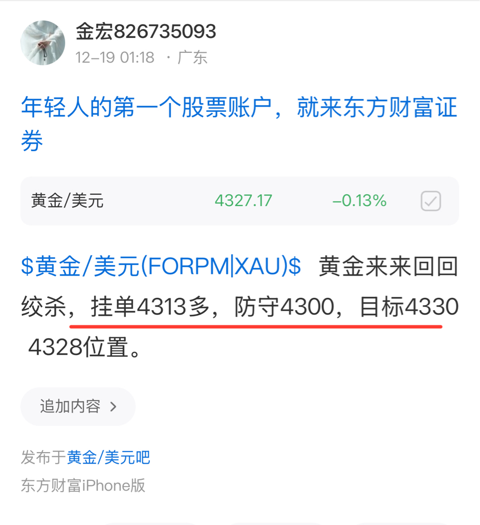 黄金凌晨挂单,一直给不到位置,早盘直接扫进场,这一波4313多,减仓吃肉日内继续