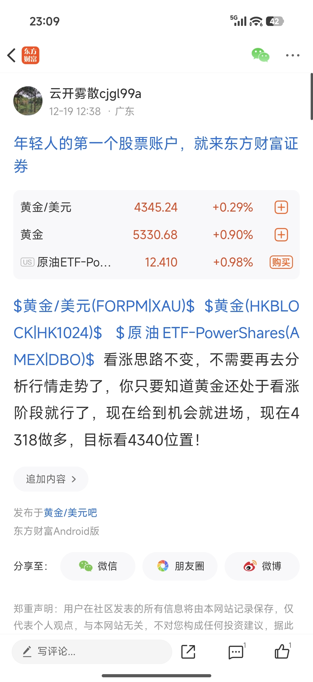 $黄金/美元(FORPM|XAU)$ $黄金(HKBLOCK|HK1024)$ $原油ETF-PowerShares(AMEX|DBO)$ 多头趋势就只需要做多,我们要以正确的方式去操作单子,今天继续以做多方式对待,最终顺利平仓,4318多平仓于4340,拿下220个点,请问大家都跟上了吗?跟上的朋友留下给力二字,把气氛搞起来!