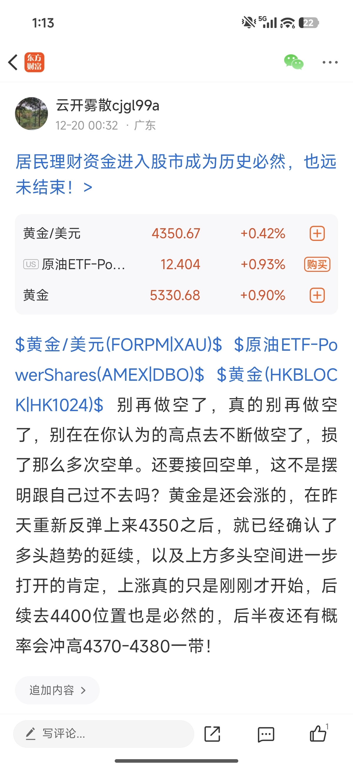 $黄金/美元(FORPM|XAU)$ $原油ETF-PowerShares(AMEX|DBO)$ $黄金(HKBLOCK|HK1024)$ 听话就对了,不会害你们的,只会为你们好,出发点都是希望你们完美规避亏损,安心拿到收获,这是宗旨,也是核心问题!别再做空问题上跃跃欲试了,断了这个念想。我宁愿你高位直接追多,但不要抱有任何一思做空的想法,赶紧打断!