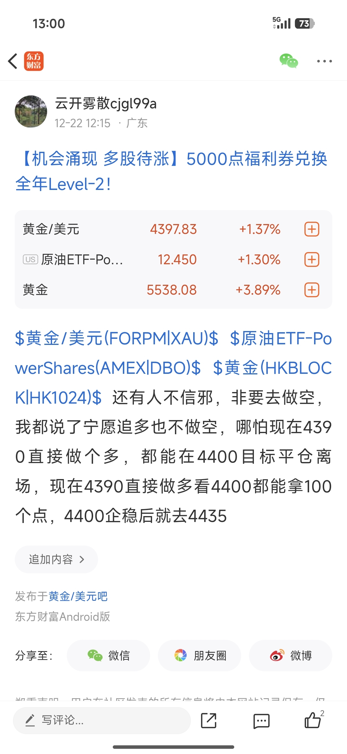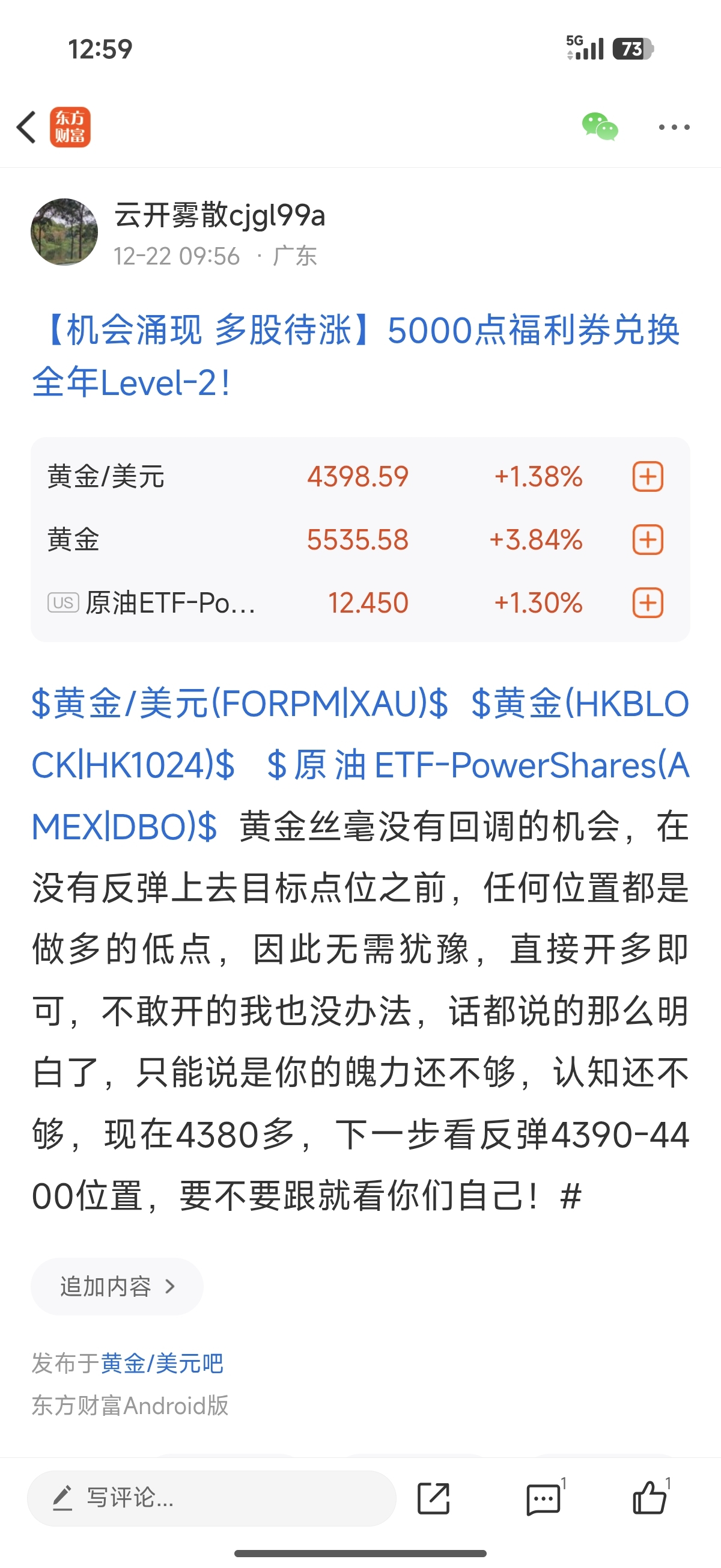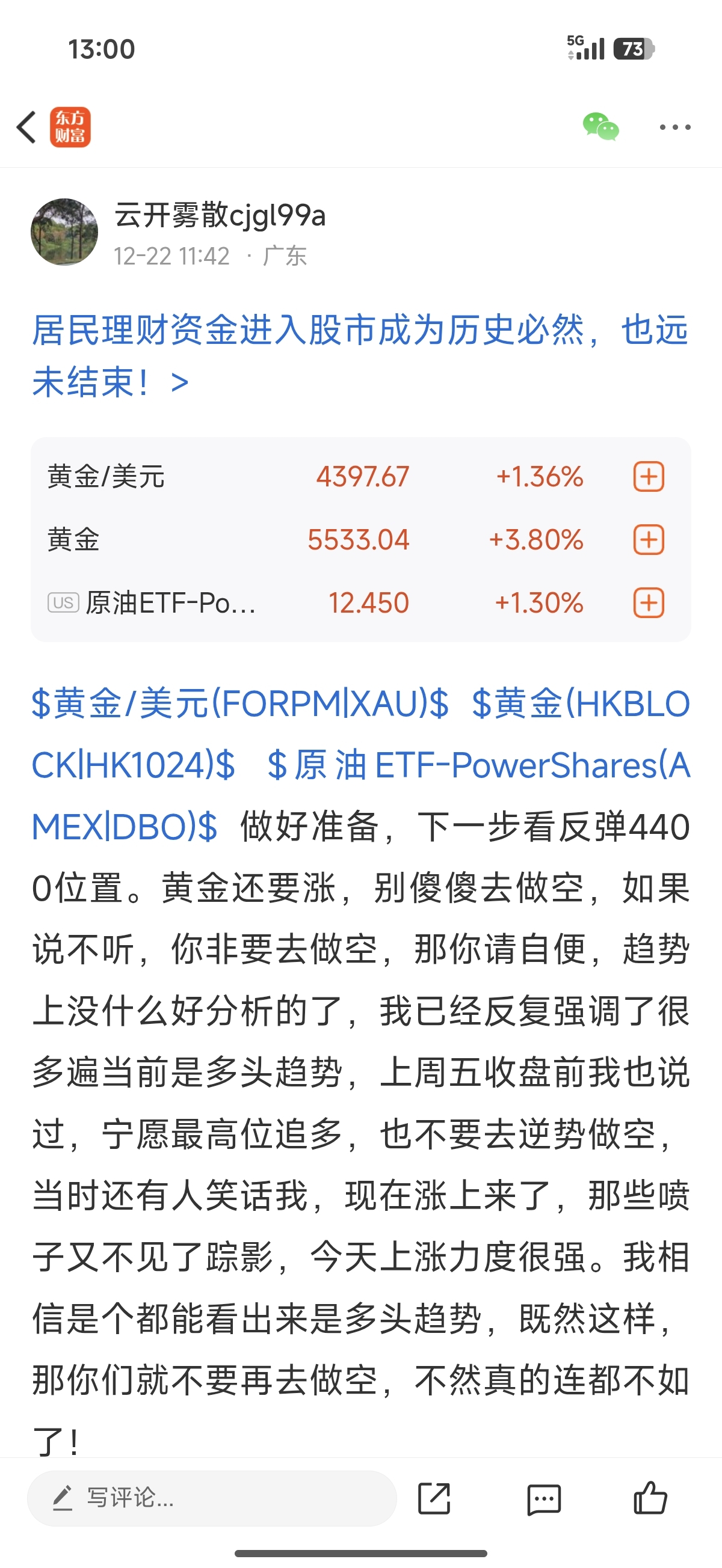 $黄金/美元(FORPM|XAU)$ $黄金(HKBLOCK|HK1024)$ $原油ETF-PowerShares(AMEX|DBO)$ 还需要我再重复一遍多头趋势的厉害?上周说看4400目标,今天也说了看4400目标,一直都在说,就看你们有没有去做,继续平仓离场,再次拿下新收获