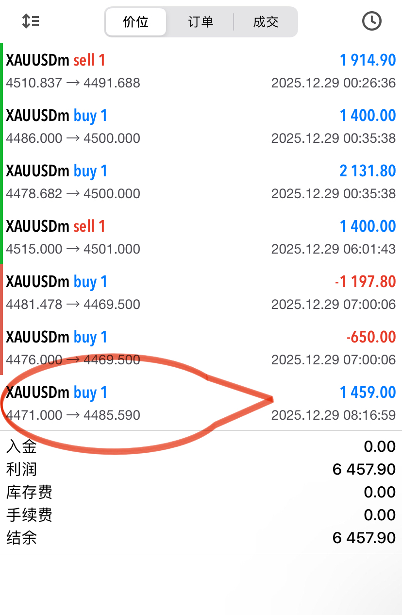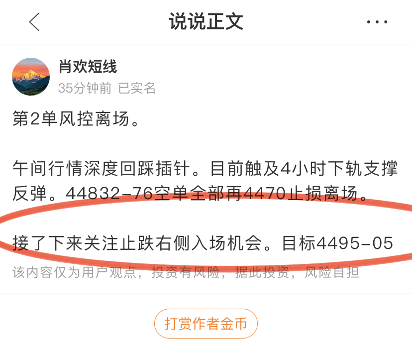 上一单提示关注止跌右侧接回多单。4471多单现价4485止盈拿下15个点1500刀。