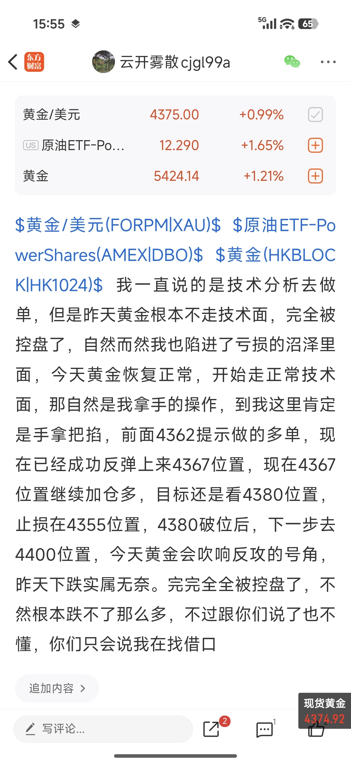 $黄金/美元(FORPM|XAU)$ $黄金(HKBLOCK|HK1024)$ $原油ETF-PowerShares(AMEX|DBO)$ 4362位置提示的多,现在反弹上来4380目标又可以平仓离场,再次带你们拿下180个点的收获,加上前面在4362-4367-4370三个位置提示进场的多单也在4380目标平仓离场,今天带你们连胜四单,一共拿到590个点的收获!
