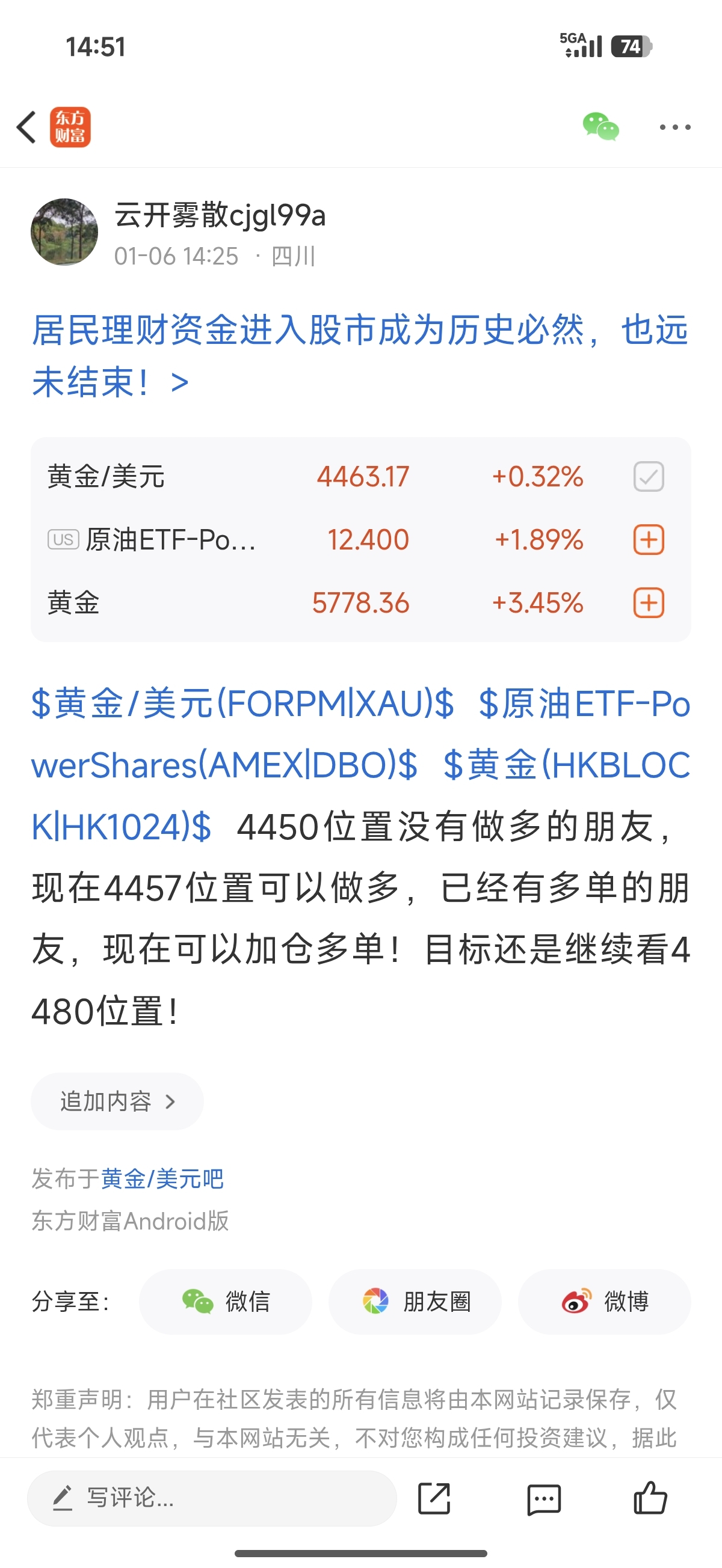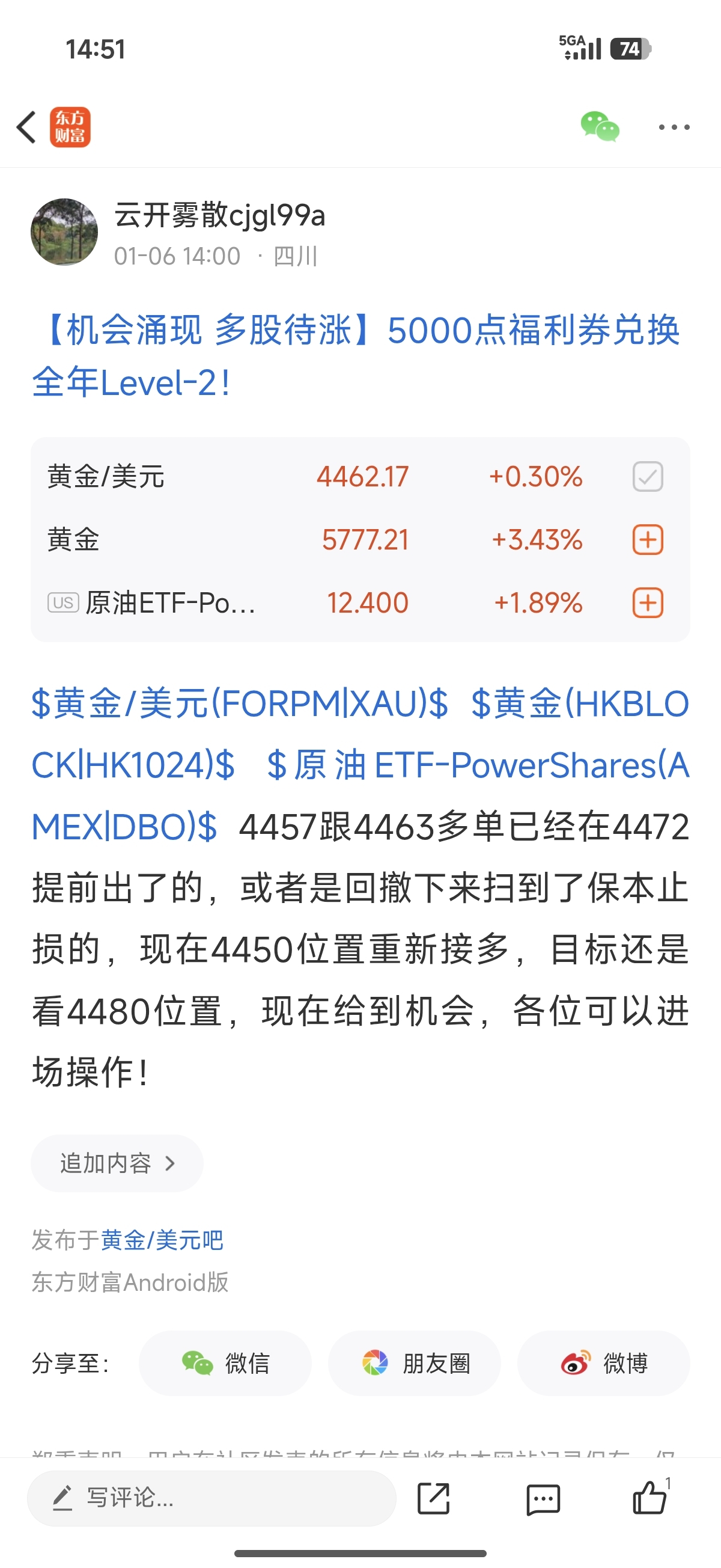 $黄金/美元(FORPM|XAU)$ $黄金(HKBLOCK|HK1024)$ $原油ETF-PowerShares(AMEX|DBO)$ 4450跟4457的多单是目前手上持有的单子,现在可以设置好保本止损,跟着我继续看4480位置
