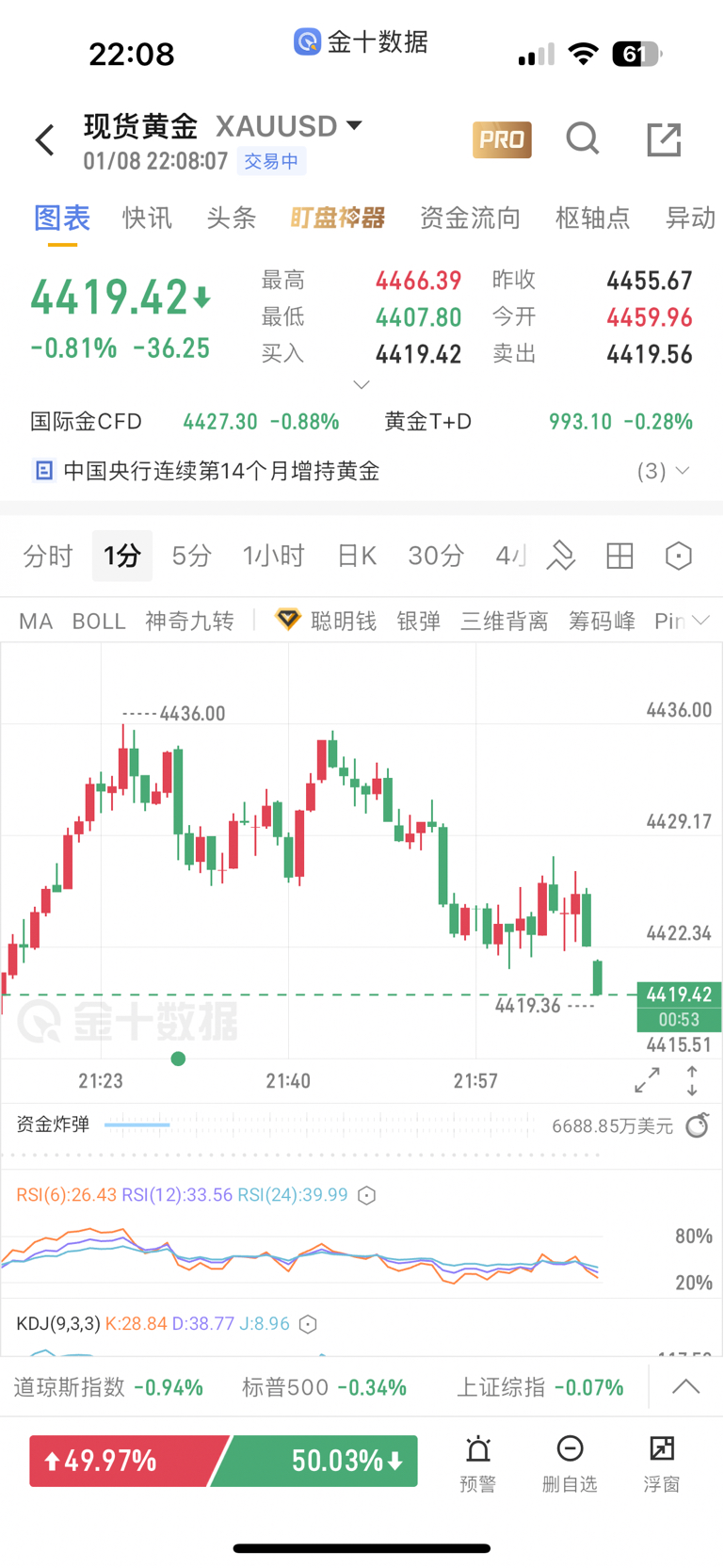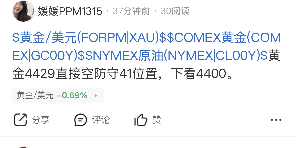 $黄金/美元(FORPM|XAU)$ $COMEX黄金(COMEX|GC00Y)$ $NYMEX原油(NYMEX|CL00Y)$ 现在也下来4419进的可以出,想下看留部分自行把握。