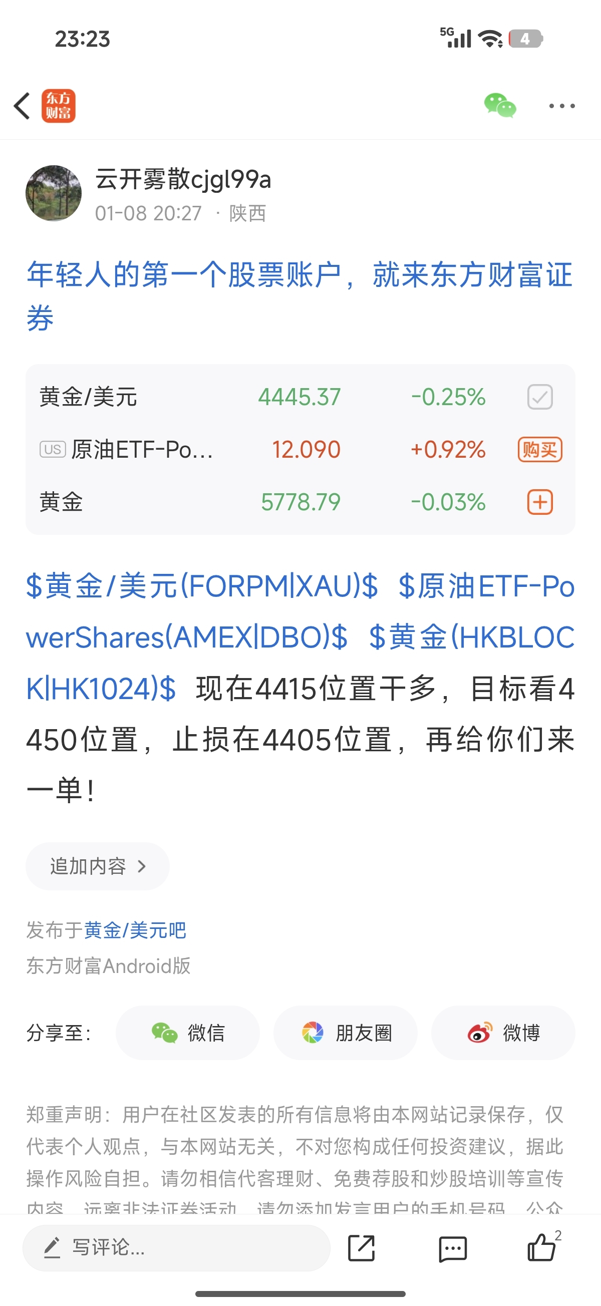 $黄金/美元(FORPM|XAU)$ $原油ETF-PowerShares(AMEX|DBO)$ $黄金(HKBLOCK|HK1024)$ 啥也别说了,4450目标点位到达,大家立即把手上4415位置进场的多单现在给平仓出来,明天黑色星期五可以留部分余仓继续看重返4500位置,前提是带好保本止损,不想看4500的,就直接现在全部平仓出来,这一单带大家拿到350个点的利润!