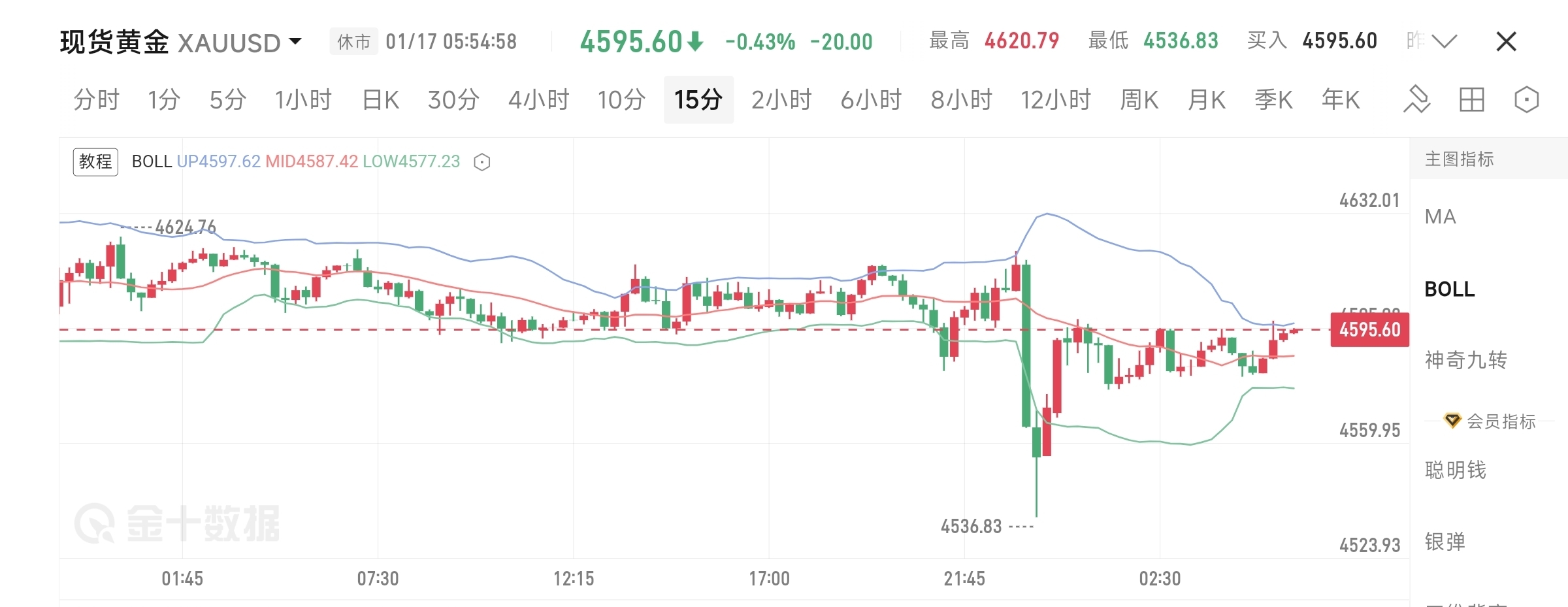 就在大家以为行情稳了的时候,黄金就跟坐了滑梯一样,直接从4620附近砸到4536,短短时间跌了近80美金!