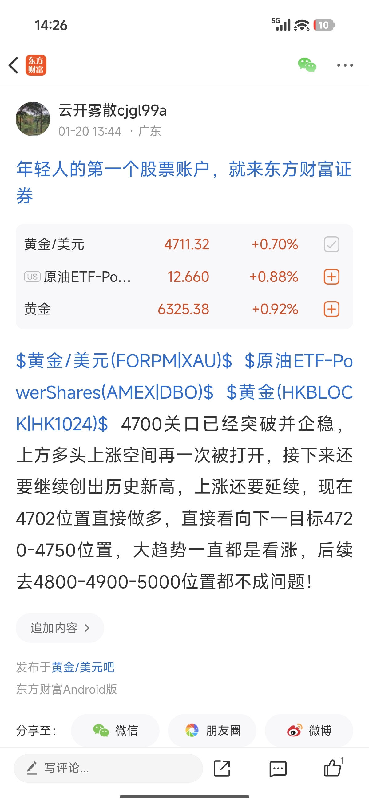 $黄金/美元(FORPM|XAU)$ $黄金(HKBLOCK|HK1024)$ $原油ETF-PowerShares(AMEX|DBO)$ 现在黄金如期而至的反弹,已经反弹到了4713位置,提示你们在4702位置进场的多单可以现在4713位置减仓离场,剩下的看反弹4720-4750位置,跟上了多单操作的朋友说句话!