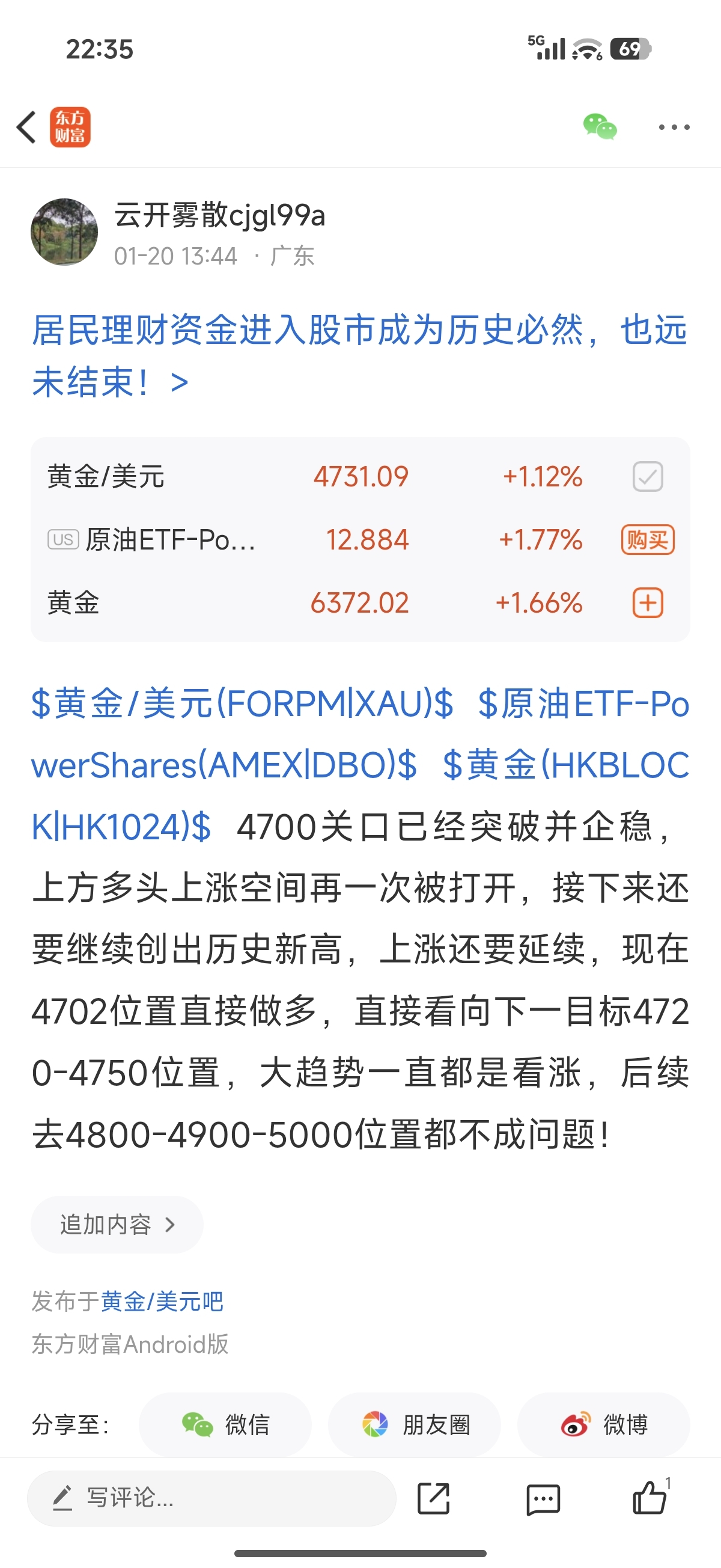$黄金/美元(FORPM|XAU)$ $黄金(HKBLOCK|HK1024)$ $原油ETF-PowerShares(AMEX|DBO)$ 准不准?牛不牛?给不给力?说了看4750就看4750,黄金最高也是触及到了4750位置之后就马上回落!4702多单跟4718多单全部都在4750目标全部出了!就一个字,爽!!!!!这两单又带你们拿下80美金的收获,也就是800个点的利润!
