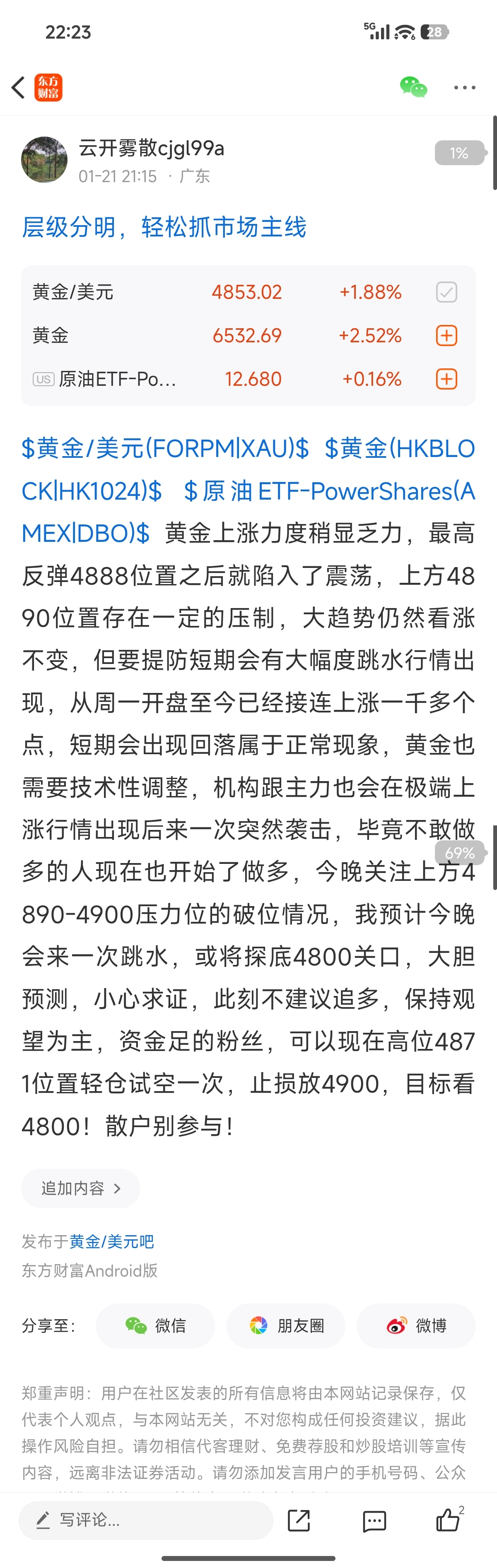 $黄金/美元(FORPM|XAU)$ $黄金(HKBLOCK|HK1024)$ $原油ETF-PowerShares(AMEX|DBO)$ 好好看看黄金现在是不是大跳水了,是不是完全符合我一开始的预测,我都跟你们说了上方存在压力,提防今晚会出现大跳水行情,问题是你们在4871高位试空,现在黄金大跳水,行情完完全全就是照着我说的在走,也带你们拿到了丰厚的收获!
