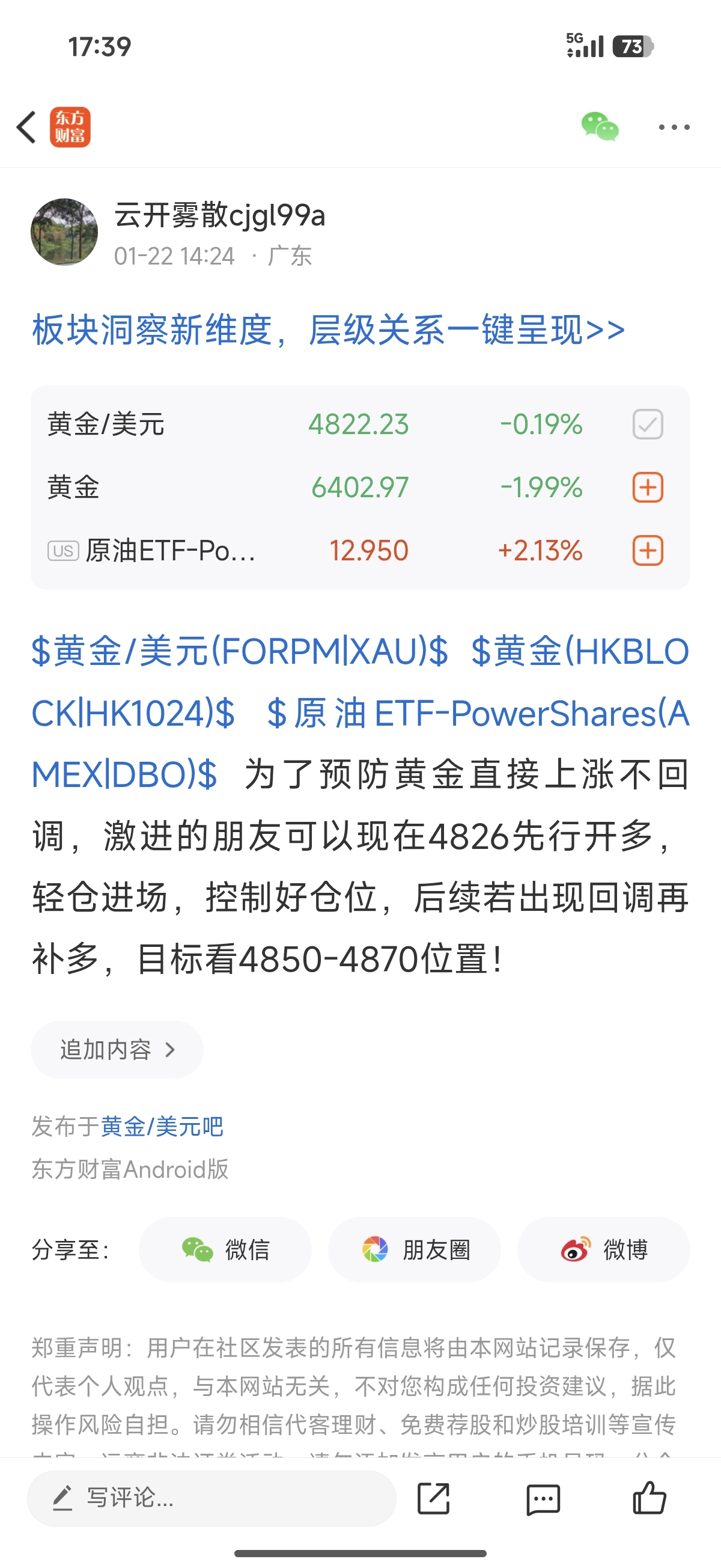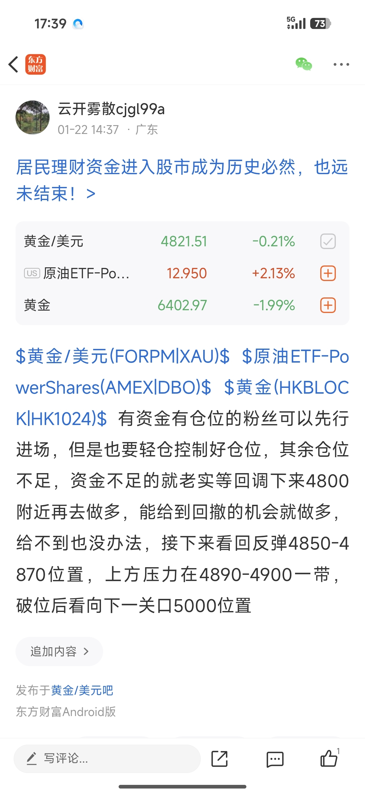 $黄金/美元(FORPM|XAU)$ $黄金(HKBLOCK|HK1024)$ $原油ETF-PowerShares(AMEX|DBO)$ 继续看反弹4850-4870位置,没做多的朋友自己找机会做多,回撤下来就找机会进场,已经有多单的粉丝就继续耐心持有好,后续如果需要补仓我再通知你们,按照我开头说好的去做就行了!