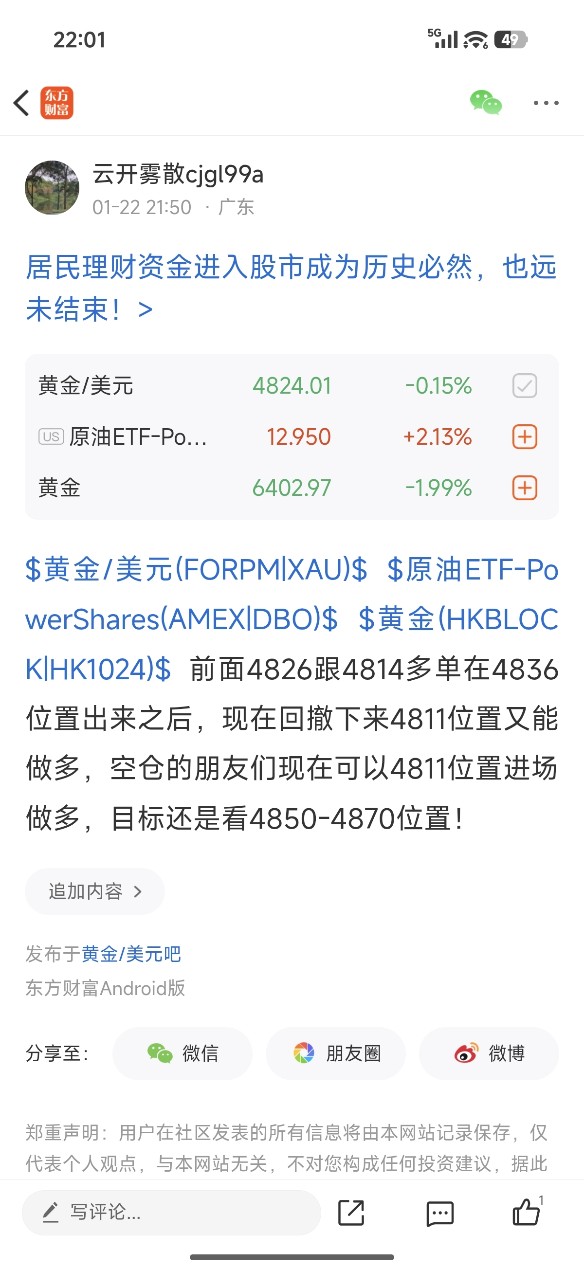 $黄金/美元(FORPM|XAU)$ $黄金(HKBLOCK|HK1024)$ $原油ETF-PowerShares(AMEX|DBO)$ 回撤下来4811位置果断提示做多,这单你们跟上没?单子进场后马上又反弹上来4825位置,跟上操作的粉丝又能止盈多单,这种行情操作起来最爽,给到回撤就做多,做了进去就能止盈,简直是无缝连接连续止盈,就看你们都跟上没!跟上了就又可以吃肉了!