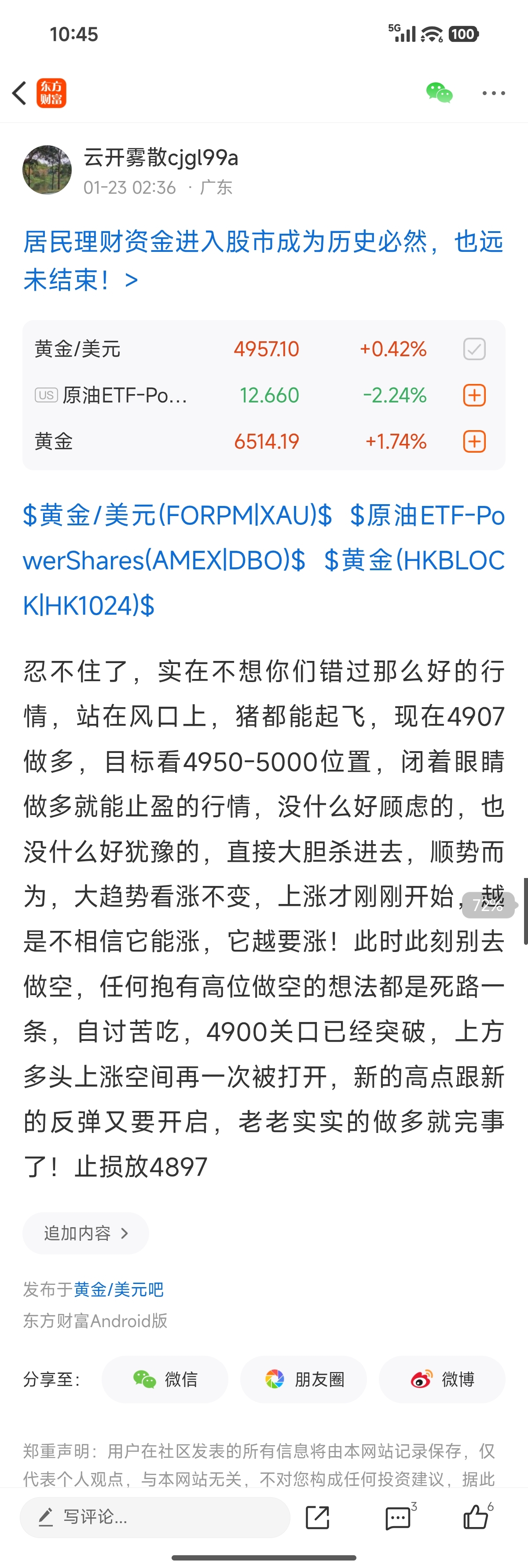 $黄金/美元(FORPM|XAU)$ $黄金(HKBLOCK|HK1024)$ $原油ETF-PowerShares(AMEX|DBO)$ 4907多单,完美在4950位置止盈离场,完美拿下43美金,行情又是按照我说的在走,我随意拿捏行情,这对我来说完全就是小菜一碟!