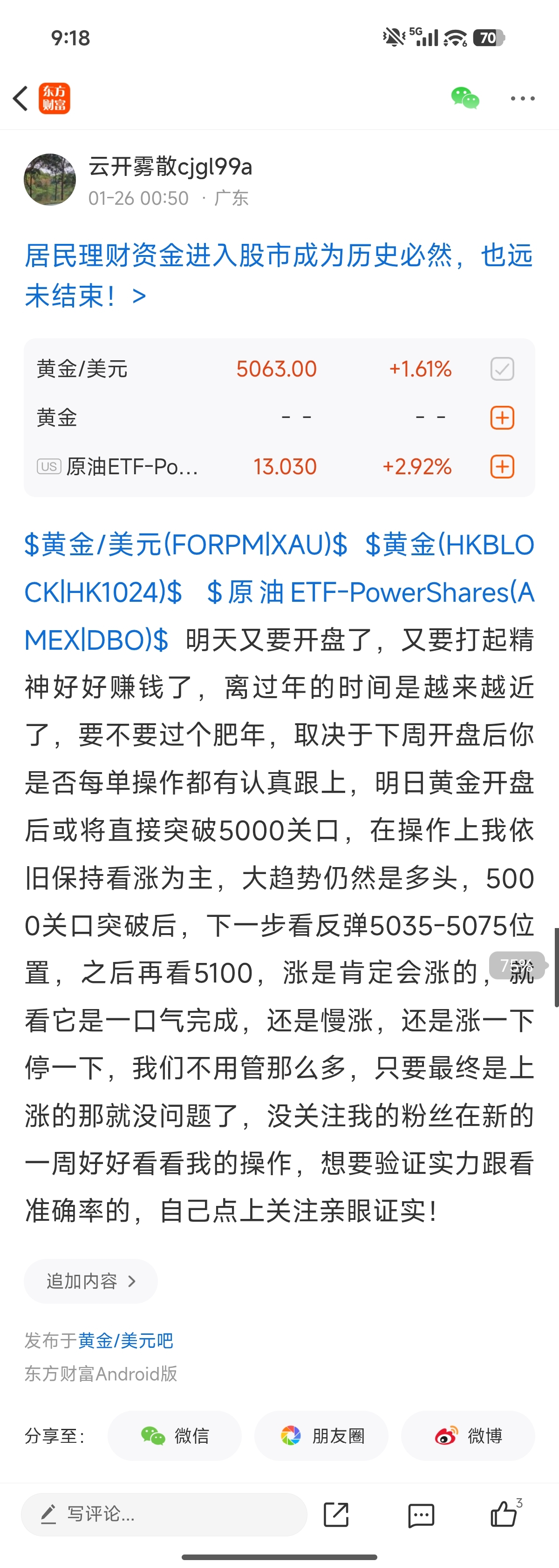 $黄金/美元(FORPM|XAU)$ $黄金(HKBLOCK|HK1024)$ $原油ETF-PowerShares(AMEX|DBO)$ 都听话照做了吗?没开盘前就告诉过你们开盘后黄金会怎么走,也告诉过你们该怎么做,开盘后黄金叶确确实实按照我说的在走,最高也反弹到了5093位置,我是不是分析的跟精准,布局的很成功,所给出的目标点位是不是都如期到达,你们有没有把我的话听进去?